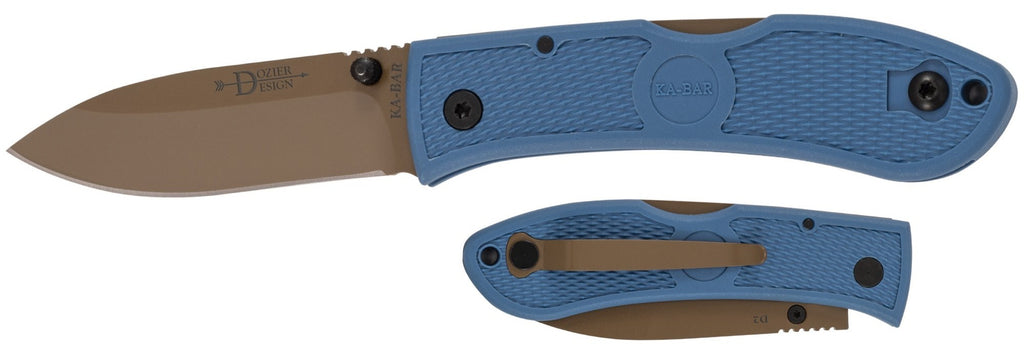 The Award-winning lock back designed by Bob Dozier is an affordable, practical all-purpose knife appropriate for daily tasks. This special D2 version comes with a coyote tan coated drop point blade and textured steel blue Zytel handles, and it makes the perfect EDC knife. The 4062D2 features a reversible pocket clip and thumb stud. Be sure to check out all the KA-BAR Dozier folders.