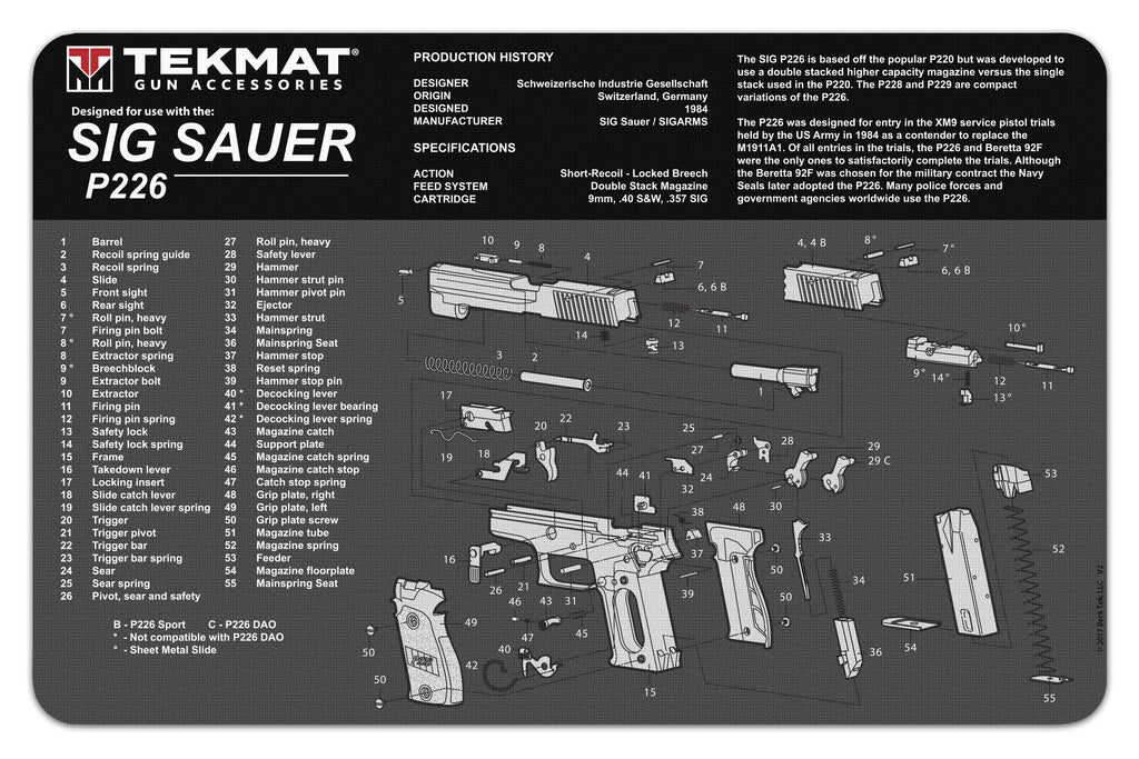 TekMat is the creator of original printed cleaning and maintenance mat. Our TekMats are large enough to handle a fully disassembled handgun with room to spare for tools and accessories. The 1/8” padding on these mats not only provides a premium feel and high level of quality but it offers extra protection from any rough handling or drops while working on your firearm. The ultra soft, oil and water-resistant surface helps protect your firearm from scratches while the diagrams and illustrations help with cleaning, disassembly and are just plain fun to look at.