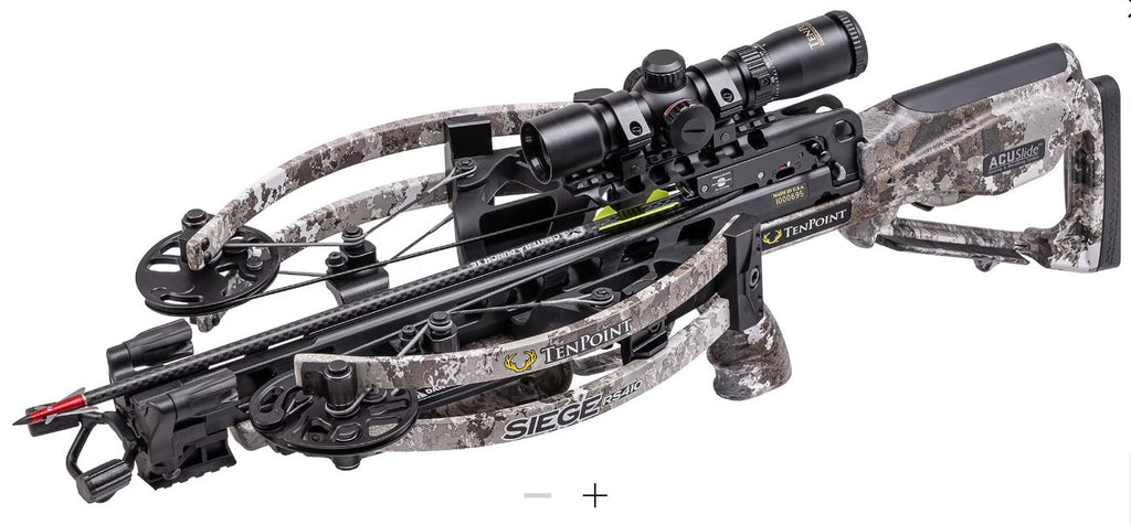 Offering tremendous performance and agility at a great price, the TenPoint® Siege RS410 Crossbow Package with ACUslide™ delivers great speed and accuracy. Packed with advanced TenPoint design, the lightweight and compact Seige RS410 launches arrows up to 410 fps from a platform that measures just 26-1/2" long and 7-1/2" wide (cocked). Creating power from a lengthy 13.5" power stroke and advanced powerplant, the RS410's RX7 Cams rotate an incredible 360° for big speed and turn smoothly without lean thanks to TenPoint's Vector-Quad™ cable technology to deliver straight-nock travel on shot after shot for repeatable downrange accuracy. This reverse-draw design draws the string through the riser for a longer power stroke, creating a smoother, quieter shot, greater speed, and longer nock engagement. This advanced riser also creates superior balance, making it easier to hold the Seige RS410 steady while shooting. Outfitted with TenPoint's 2-stage S1 trigger, this crossbow offers a zero-creep, advanced roller-sear system that produces a consistent, crisp, 3-1/2 lb. pull with DFI™ (Dry-Fire-Inhibitor) protection. Adjustable design includes an adjustable tactical-style butt stock with an adjustable butt plate for length-of-pull adjustment. ACUslide cocking system reduces cocking effort to just 5 lbs. and allows you to safely de-cock the crossbow with its advanced Auto-Brake Gear System. Weight: 7.5 lbs. (bow only). Package includes: Rangemaster PRO Scope, 6-arrow quiver, 6 EVO-X 16 CenterPunch carbon arrows, integrated string stop system.