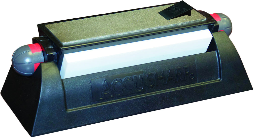 This rotating, three-stone system is equipped with coarse diamond, medium alumina-oxide, and ne ceramic stones and an angle guide to assist in maintaining a consistent angle. The base features slip resistant feet, but can also be attached to a work surface if preferred.