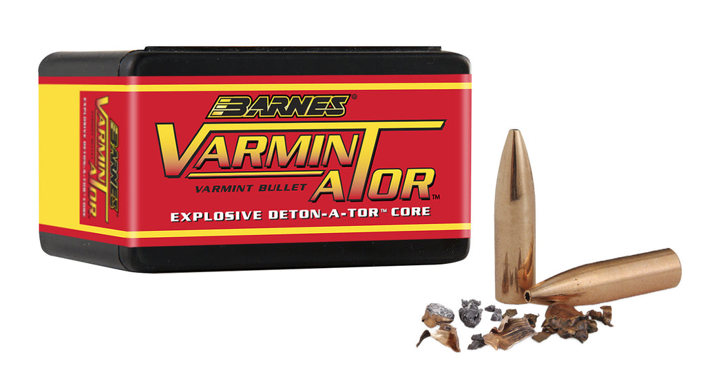Designed for .20 and .22 caliber and 6mm, the Barnes Varminator Bullets are powerful, explosive, and accurate. Made with a lead core and classic hollow point, the bullets use a scored nose cavity. For smaller game hunting, including prairie dogs and squirrels, the bullets have a thin and tapered jacket that violently fragments upon impact.